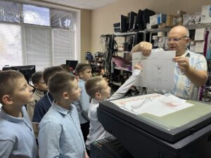 Александр Владимирович познакомил ребят с ксероксами и показал, как они работают — от загрузки бумаги до получения готового отпечатка. Ребята внимательно слушали рассказ о тонере, барабане и процессе переноса изображения на бумагу. Кроме того, Александр Владимирович рассказал, что в компьютерном центре занимаются ремонтом компьютеров и ноутбуков, устраняют неполадки и восстанавливают работоспособность техники. Особое внимание уделил работе с блоками питания и стабилизаторами напряжения, объясняя важность защиты оборудования от скачков электричества. Также ребята узнали, что в компьютерном центре занимаются заправкой картриджей.